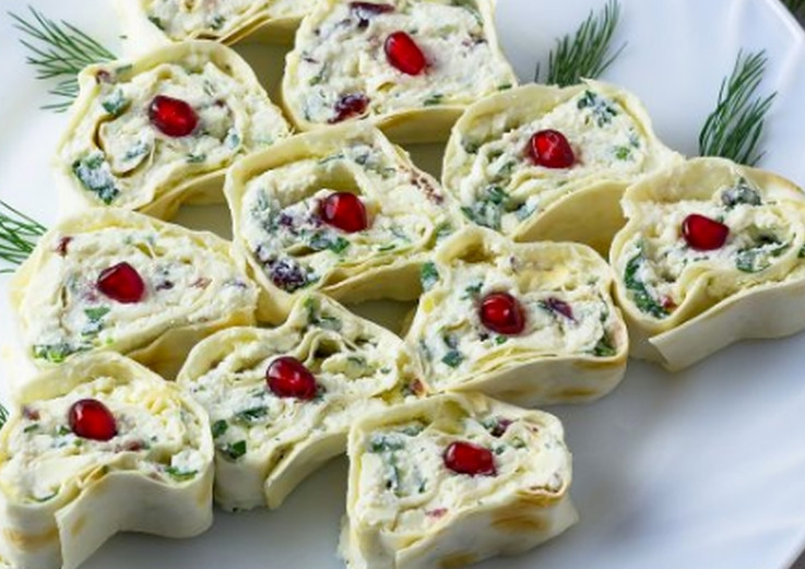 простые рецепты закусок новому году Простая и быстрая закуска из серии “гости на пороге”! Поверьте, все будут удивлены, что вы успели приготовить вкусный, нарядный рулет буквально за 20 минут! К тому же, у него есть своя изюминка! Изюминкой рулета является то, что в соленую сырную закуску добавляют сладкую вяленую клюкву. Но поверьте, это очень вкусное сочетание! Для основы рулета можно использовать лаваш или тортилью.