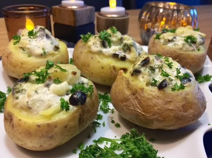 - Добавьте 1 ст. л. подсолнечного масла и хорошо перемешайте. Наполните получившейся смесью половинки картофеля непосредственно перед подачей на стол.