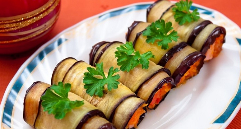 Рулетики из баклажанов с сыром и помидорами