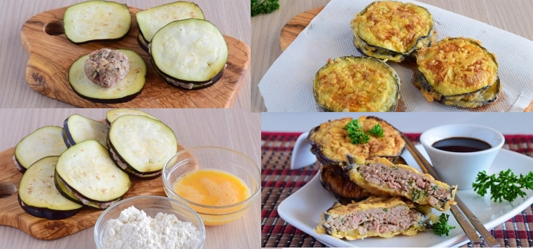 - На один кружок баклажана кладем немного мясной начинки и накрываем начинку вторым кружочком баклажана. Немного придавливаем, чтобы начинка равномерно распределилась между кружочками.