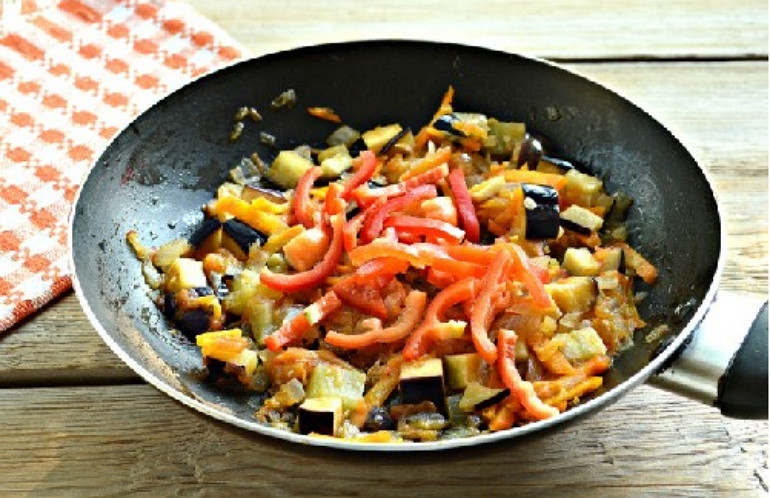 - Затем выложите в миску обжаренные баклажаны, а в этом же масле обжарьте сладкий перец до румяности. Далее верните в сковороду к перцам обжаренные баклажаны, добавьте лук и томаты, подсолите и поперчите овощи по вкусу.