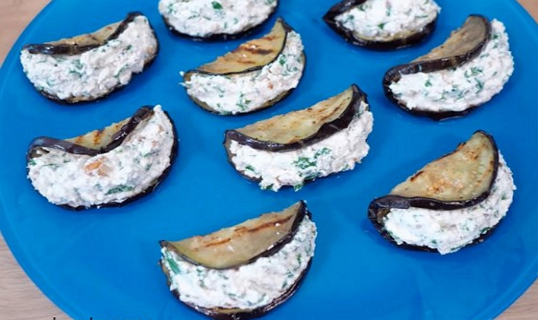 Жареные чесночные баклажаны с творогом и зеленью