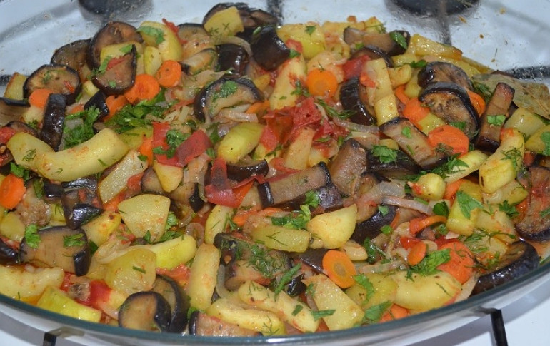 Рецепт баклажанов с овощами на сковороде