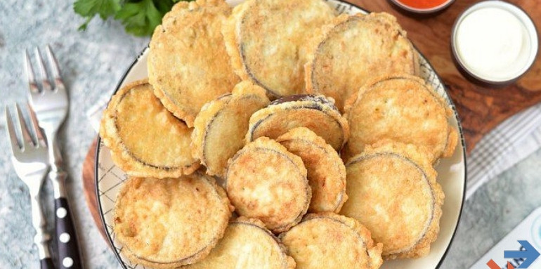 Предварительное обваливание баклажановых ломтиков в крахмале позволяет получить невесомые хрустящие кусочки с нежной мякотью внутри (если не считать баклажановую шкурку, то внутри – просто кремовая структура). Для многих такая технология может стать открытием и вдохновит на поиск новых вкусовых сочетаний!