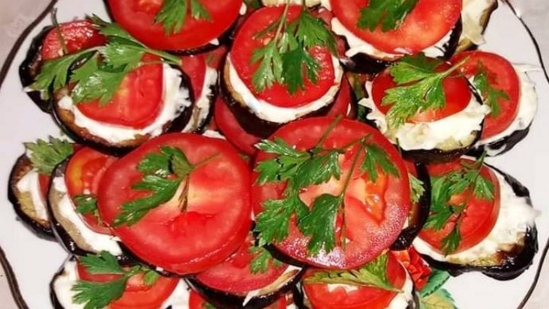 Баклажанные кружочки с помидорами и чесноком