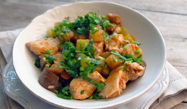 - Тушите курицу с баклажанами под крышкой, пока соус не утушиться на одну треть.