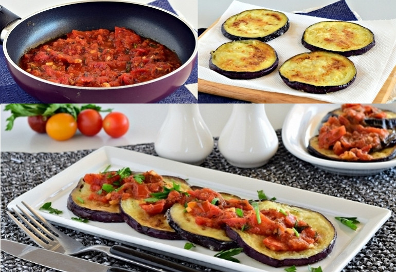 Жареные баклажанные кружочки, подаваемые с чесноком и свежими помидорами – это одна из самых распространенных летних овощных закусок. Майонез здесь не является обязательным ингредиентом, однако с ним закуска получается намного аппетитнее. Кроме того, майонез хорошо смягчает слишком острый вкус свежего чеснока.Ингредиенты: