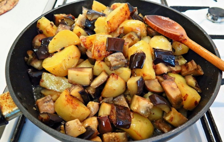 Жареная картошка с баклажанами на сковороде