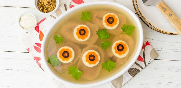 - С помощью столовой ложки заливаем ингредиенты тонким слоем бульона. Выливать сразу всю жидкость не рекомендуется, ведь в этом случае составляющие блюда могут всплыть на поверхность, а созданная вами композиция будет нарушена! Чтобы избежать подобной ситуации, убираем блюдо с тонким слоем жидкости в холодильник.
