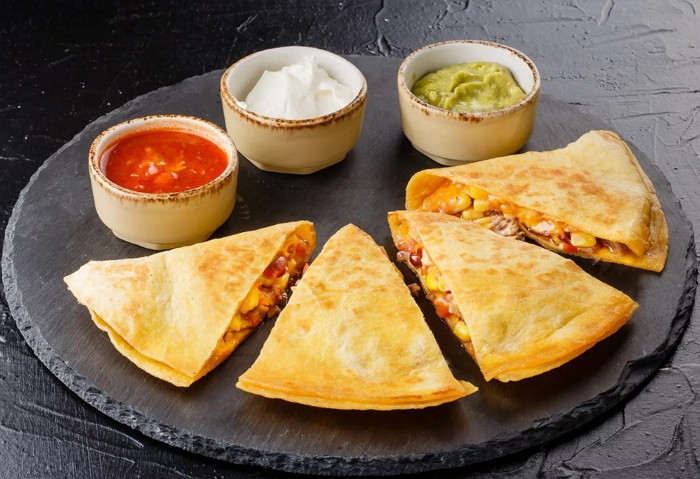 - Выложить кесадилью, порезать секторами. Подавать со сметаной и гуакамоле, которые гасят остроту. Приятного аппетита!