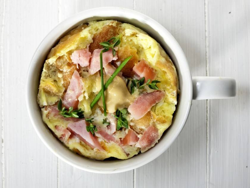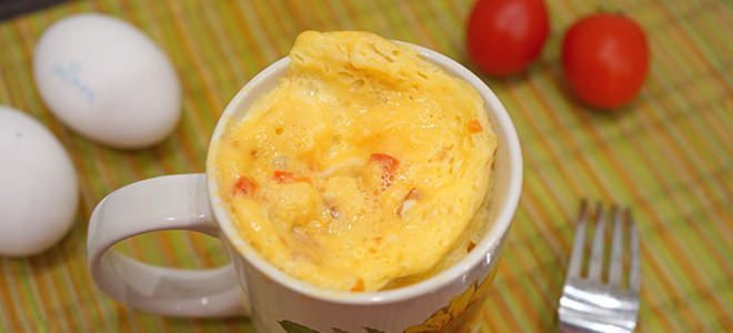 Керамическую или стеклянную кружку смазываем кусочком сливочного масла, переливаем в нее содержимое миски и отправляем в микроволновку. Готовим омлет в течение 5 минут на самой высокой мощности. Вот и все, блюдо можно подавать на стол.