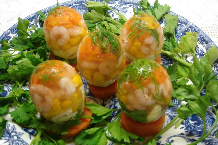 - Зелень вымыть, обсушить и отобрать красивые листики. С кукурузы слить жидкость. На дно пустой яичной скорлупы положить листики зелени, украшения из моркови. Сверху уложить, чередуя, креветки, кукурузу, кусочки яиц и листики зелени – таким образом заполнить все свободное пространство яичной скорлупы до верха и залить овощным отваром с желатином.