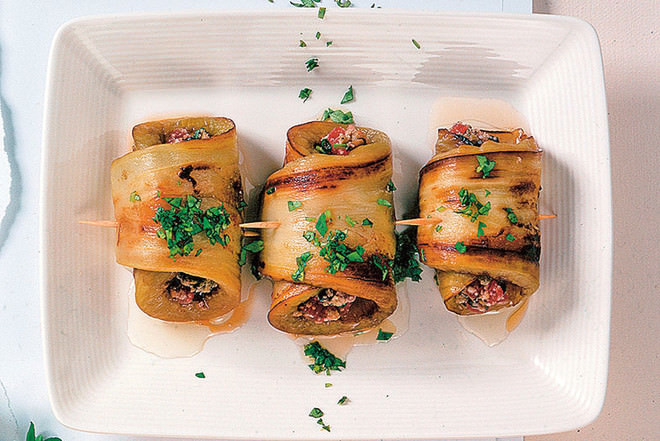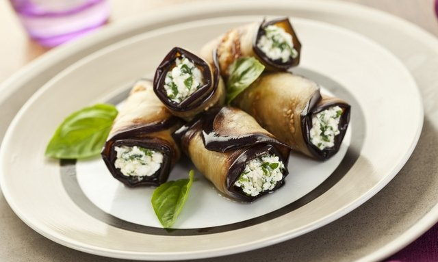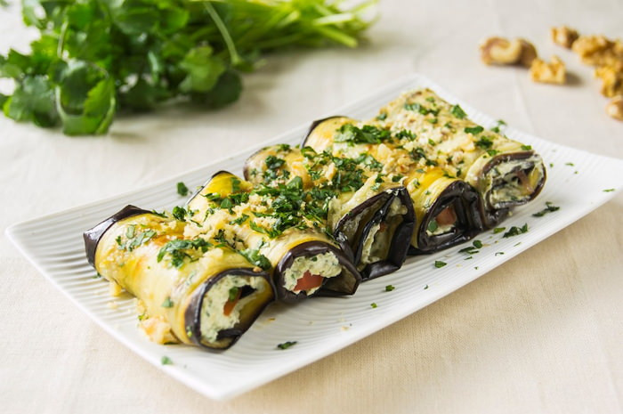 Рулеты из баклажанов с начинкой из пряных трав и сыром
