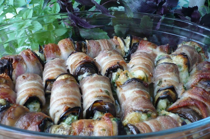 Рулетики из индейки со сладким перцем и беконом в баклажане