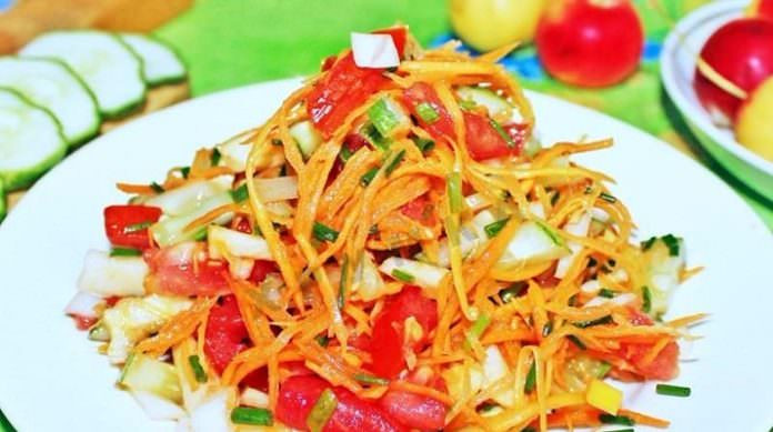 Сладкий перец нарежем соломкой, морковь натрем на терке для корейских салатов. Соединим в кастрюле все овощи. Чеснок выдавим через пресс. Всыпаем сахар. Вольем столовый уксус.
