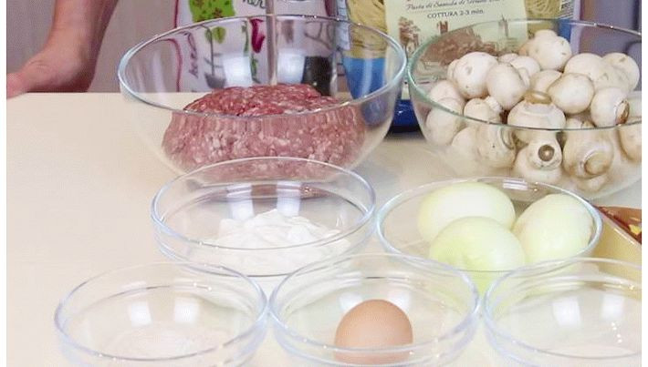 Сразу приготовьте все продукты, взвесьте все, что нужно взвесить, отмеряйте в мерном стакане то, что должно быть отмеренным. Три луковицы очистите от шелухи. Шампиньоны помойте и, если нужно, очистите. В первую очередь сделайте фарш. Сам фарш у вас может быть абсолютно любой – свиной, говяжий, куриный, смесь 2 видов. Конечно, лучше всего перекрутить фарш самостоятельно, но если такой возможности нет, то проверяйте дату изготовления, не берите замороженный и обращайте внимание на цвет и запах. Для фарша возьмите 1,5 луковицы и перекрутите ее в блендере. Чтобы легче было крутить, приготовьте 50 мл воды и немного подлейте в лук (остальное вы выльете прямо в фарш, чтобы он был сочнее).