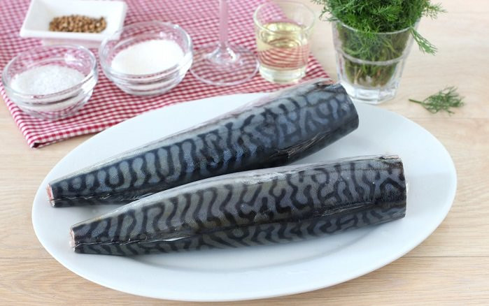 Для засолки лучше всего взять скумбрию покрупнее (тушки весом 0,5-0,6 кг), она жирнее всего, а значит и по вкусу получится отменной. Разделывать очень хорошо подмороженную рыбу, т.е. рекомендуем вынуть ее из морозилки и оставить в комнате при нормальной температуре (19-21 С), а через 2-3 часа попытаться сделать надрез около головы. Если нож свободно входит в рыбное филе – можно приступать к разделке. Из такой рыбьей тушки не будет вытекать кровь или размороженная жидкость, а кухонные поверхности и инструменты (ножи, досточка) будут чище. Отсекаем от скумбрии голову с плавниками и хвост. Удаляем капсулу с внутренними органами, вычищаем острием ножа сгустки крови под хребтовой костью, теперь промываем все брюхо от темной пленки, выстилающей его поверхность.
