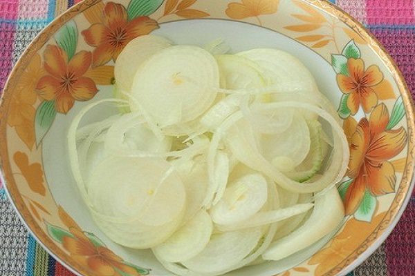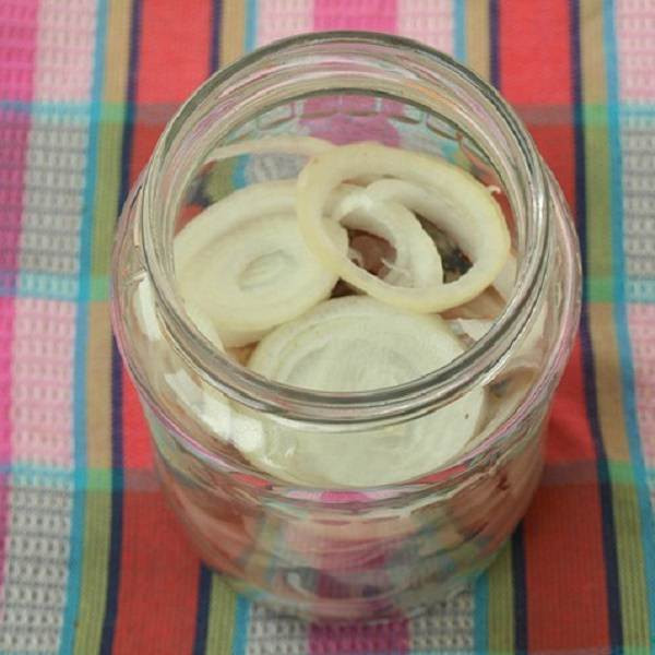 - Нарежьте филе на небольшие кусочки. Возьмите банку и устелите ее дно слоем лука, сверху выложите селедку. Наполните банку, чередуя слои сельди со слоями лука.