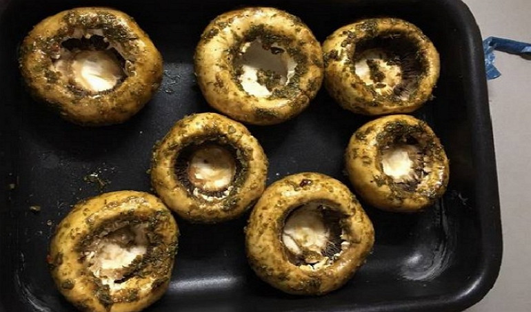 - Шляпки грибов выложите на противне или в форме для запекания и отправьте в разогретую до 180 градусов духовку буквально минут на пятнадцать, чтобы грибы приготовились.