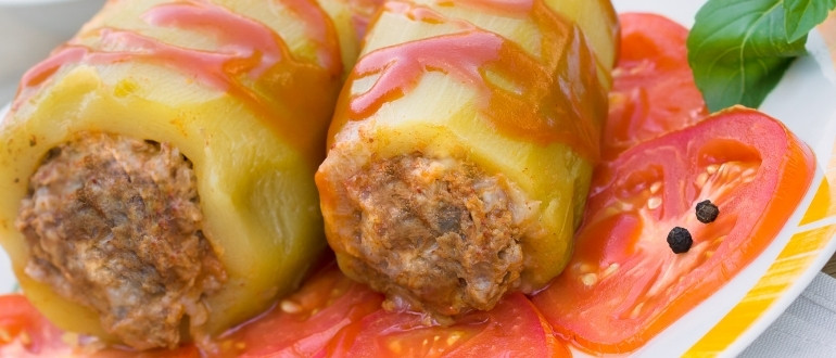 Фаршированные мясом шампиньоны с помидорами