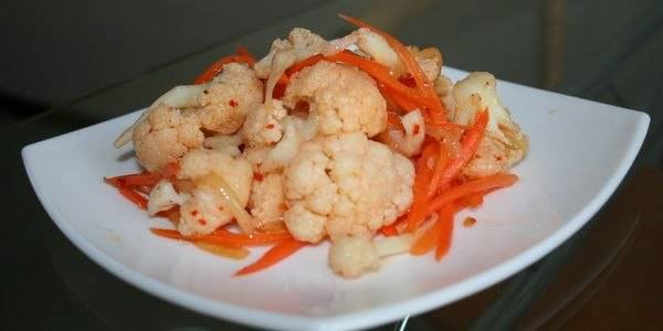 Пряно-острая закуска придется по душе всем любителям азиатских яств. Вкус цветной капусты насыщенный. Приготовьте этот салат, и он заменит на вашем столе всю привычную консервацию.