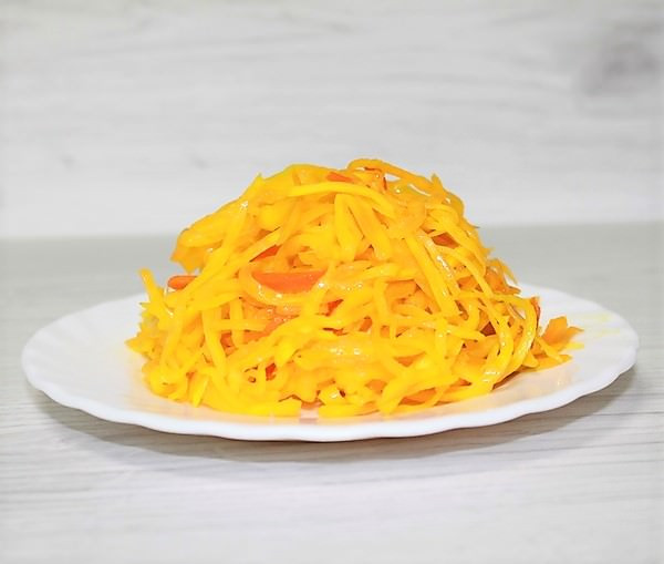 - Через 24 часа капуста с овощами промаринуется и приобретет красивый желтый цвет. Готовую капусту можно подавать как закуску к горячим блюдам или птице. Храним в закрытой стеклянной посуде. Приятного аппетита!