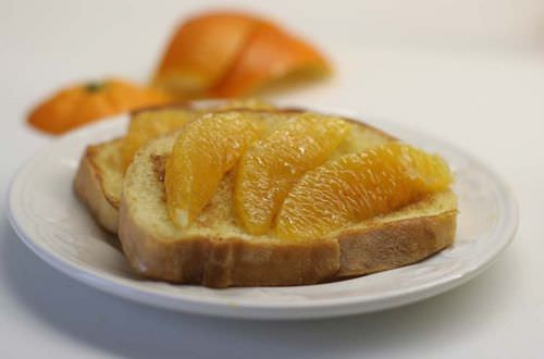 Яйцо взбейте с молоком и сахаром. Обмакните в полученную смесь хлеб и жарьте по 3–4 минуты с двух сторон на масле. Смажьте медом, сверху выложите очищенные от пленок и семечек дольки апельсина.