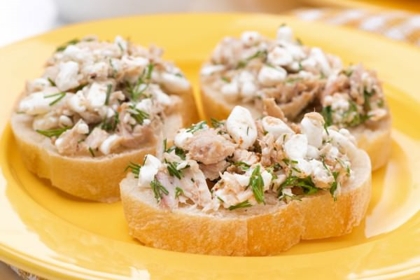 - Тунец достаем из банки, разминаем вилкой, чтобы не осталось крупных кусков. Раскладываем измельченный тунец по гренкам.