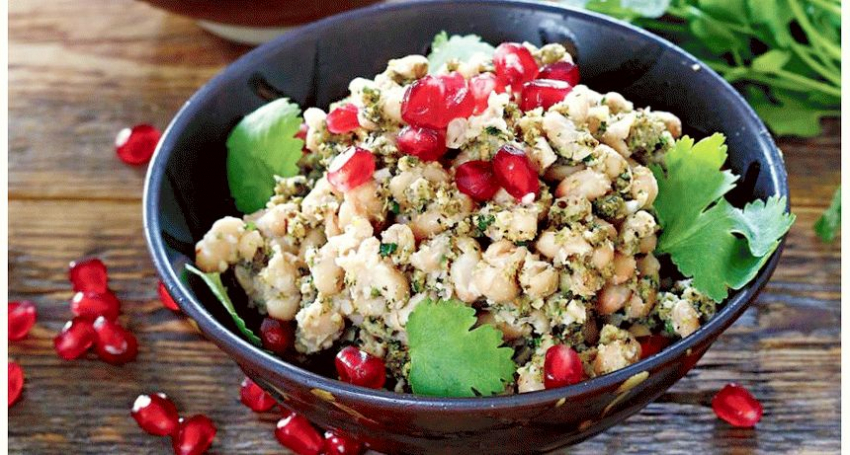 Немного разомните фасоль вилкой или пестиком. Перемешайте фасоль с ореховой пастой – на этот раз аккуратно, чтобы смесь не превратилась в пюре. Очистите гранат, вырезав «сектор» кожуры – не протыкайте кожуру насквозь, только надрезайте, иначе польется сок. Выньте гранатовые зерна, удалите пленки. Разложите пхали (рецепт из белой фасоли) по мисочкам, посыпьте гранатовыми зернами и кинзой и подавайте сразу или дайте настояться 1–2 ч, затянув миску с пхали «дышащей» пленкой