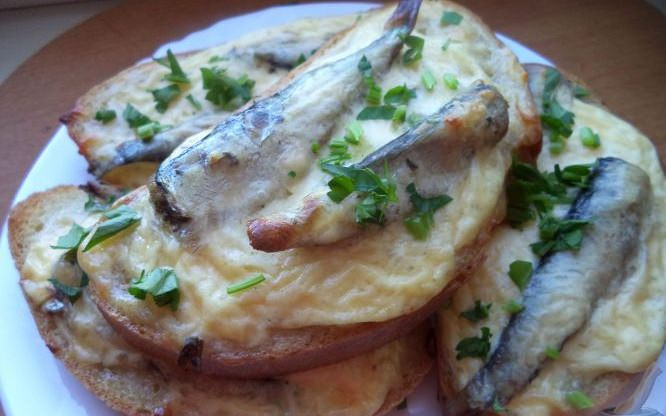 Горячие бутерброды со шпротами и сыром готовы. Подавать тосты со шпротами и сыром на стол сразу, в горячем виде. Приятного аппетита!