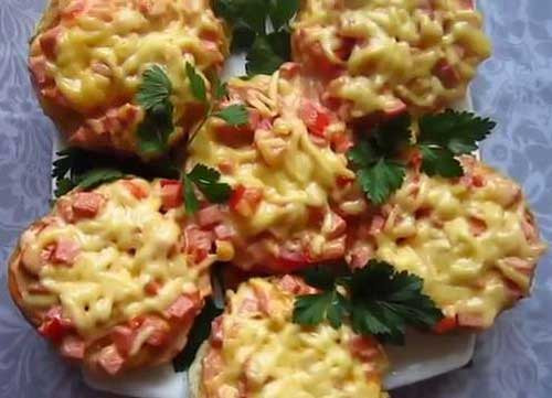 Постелить на противень бумагу для запекания и выложить бутерброды. Затем противень поставить в разогретую духовку до 150-180 градусов и запекать бутерброды в течении 7-10 минут, в конце переставить бутерброды на верхнюю полку или включить в духовке верхний нагрев, для того, чтобы образовалась аппетитная корочка.
