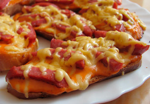 Кусочки хлеба выложите перед собой и смажьте их небольшим количеством сливочного масла. На масло водрузите четвертинки сосисок, а на них, в свою очередь, положите ломтики помидора. Посыпьте все это тертым сыром и отправляйте в разогретую до 220 градусов духовку на 3-5 минут или до образования аппетитной золотистой корочки на хлебе и на сыре.
