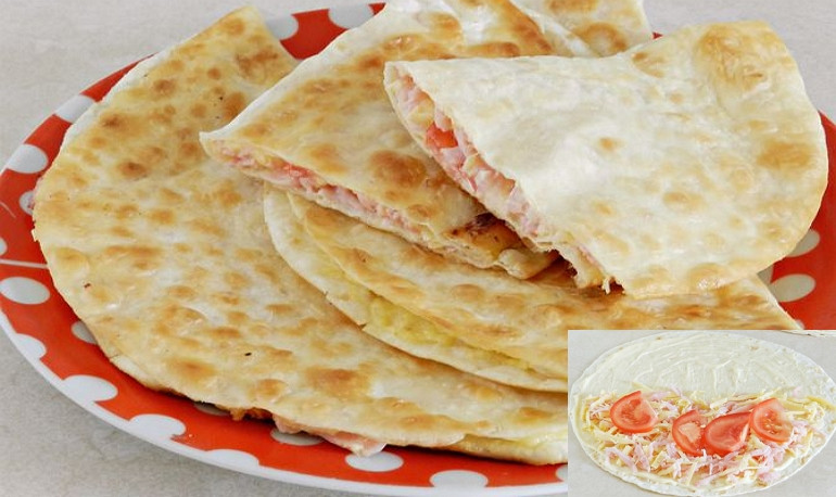 Жареный лаваш с начинкой из колбасы, помидора и сыра