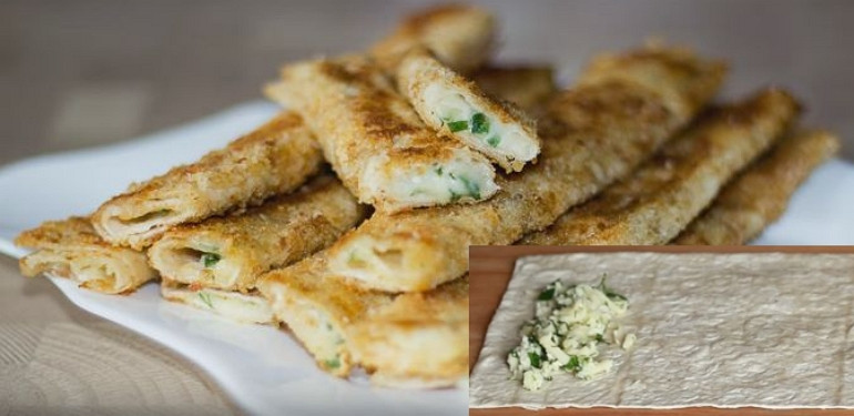- Каждую трубочку обмакните в яйце и обваляйте в сухарях. Обжарьте трубочки из лаваша с сыром с двух сторон до румяности.