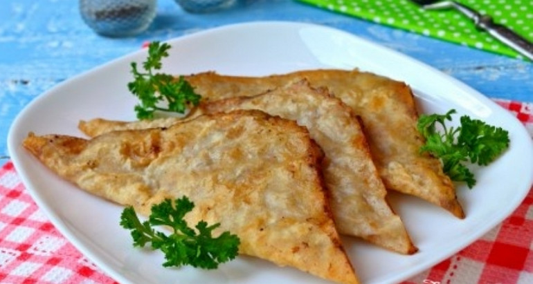 - Сковороду разогреть с растительным маслом (масла не нужно наливать слишком много), выложить подготовленные треугольники.
