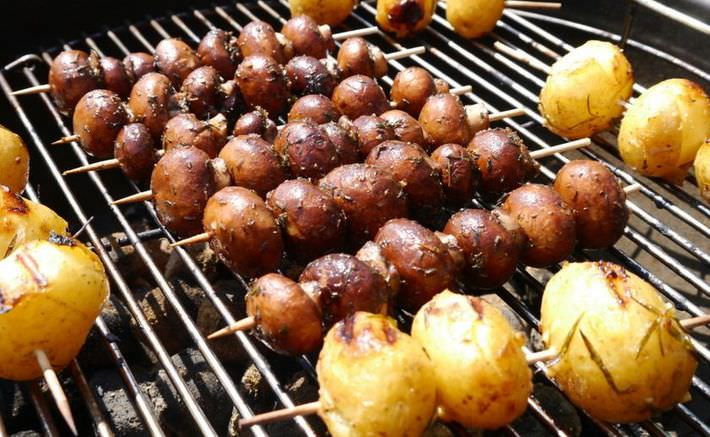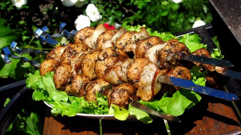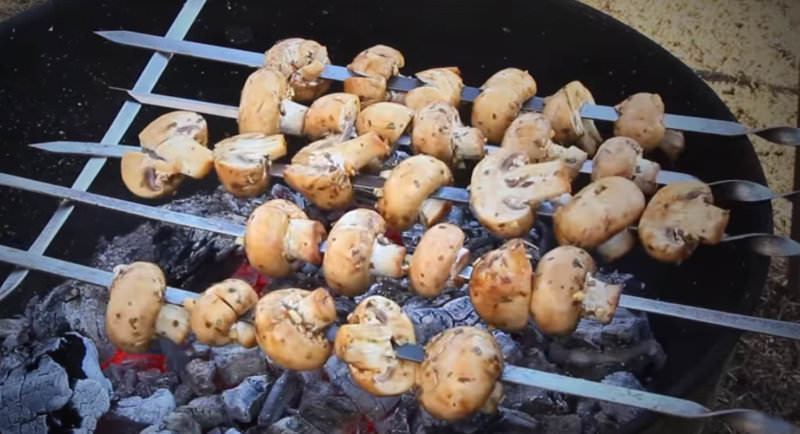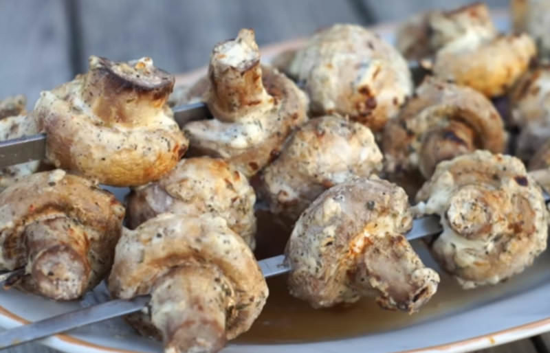 Шампиньоны — грибы, доступные круглый год. Готовить шашлык желательно из свежих грибов. Чтобы они получились сочными и не выделяли воду, их нужно солить и перчить после жарки. Шампиньоны станут хорошим гарниром к мясу.