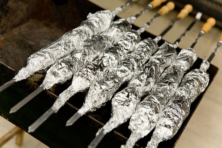 - Раскрываем фольгу и подаем шашлыки к столу картофелем или овощами.