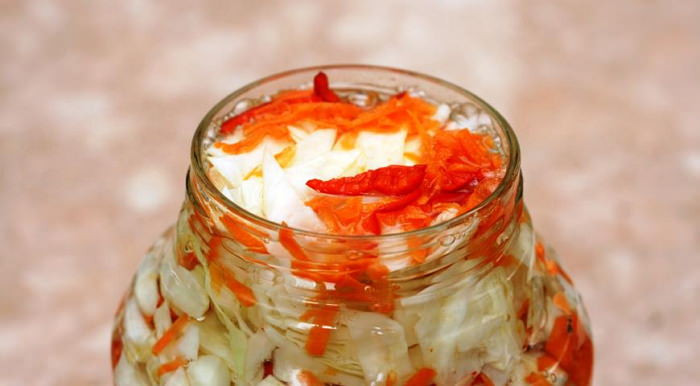 - По истечении этого срока капустка готова к употреблению, её разложить в банки, убрать в холодильник на хранение.