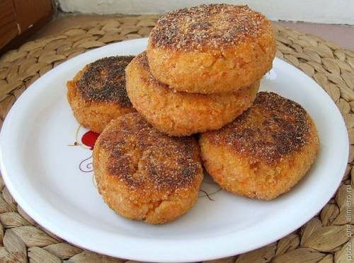 - Если же хочется настоящего подобия мясных котлет, то фарш из моркови берут ложкой, кладут в горку муки, обваливают в ней (можно применять панировочные сухари вместо муки) со всех сторон, придают форму биточка или котлеты и далее жарят как обычные мясные котлеты на разогретой сковороде с маслом.
