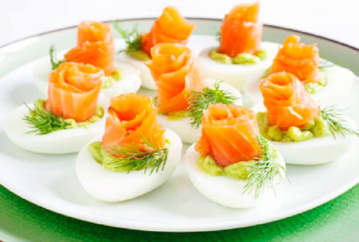 - Филе малосольного лосося нарежьте крупными кубиками, выложите в центр каждой половинки яйца, украсьте листиком свежей зелени. Подавайте фаршированные яйца с малосольным лососем на праздничный стол в качестве холодной закуски.