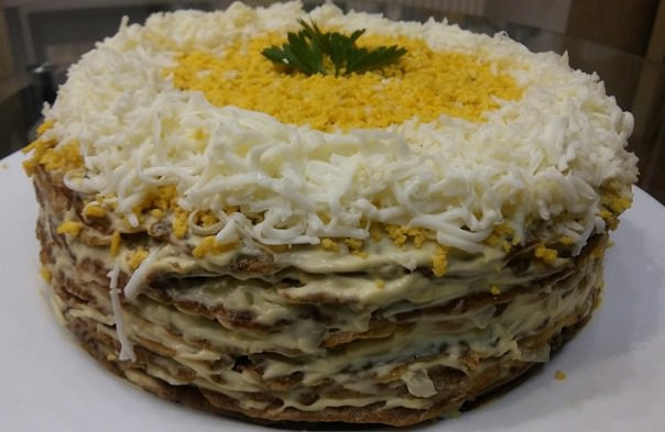 Печеночный торт из куриной печени с грибами