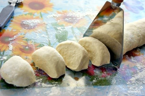 Из теста сформировать колбаску. Затем нарезаем её на одинаковые кусочки, весом приблизительно по 65 г. Раскатать из теста лепёшку и распределить фарш тонким слоем по половине лепёшки.