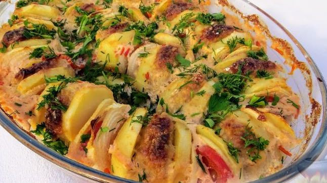 Ставим композицию в духовку, разогретую до 220 С, и запекаем 15 минут. А пока картошка с котлетками запекаются, приготовим сметанную заливку, смешав сметану с водой и приправив по вкусу. Также можно добавить в соус ложку кетчупа или томатного сока.