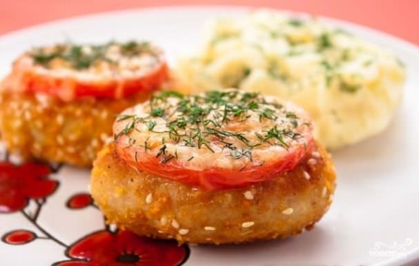 Порезать помидоры кружочками, репчатый лук колечками. На каждую котлету выложить по кружочку помидора и колечки лука, слегка присолить. Присыпать тертым на крупной терке сыром. Запекать в разогретой заранее до 190 градусов духовке 25 минут. Подавать с овощами или любым гарниром.