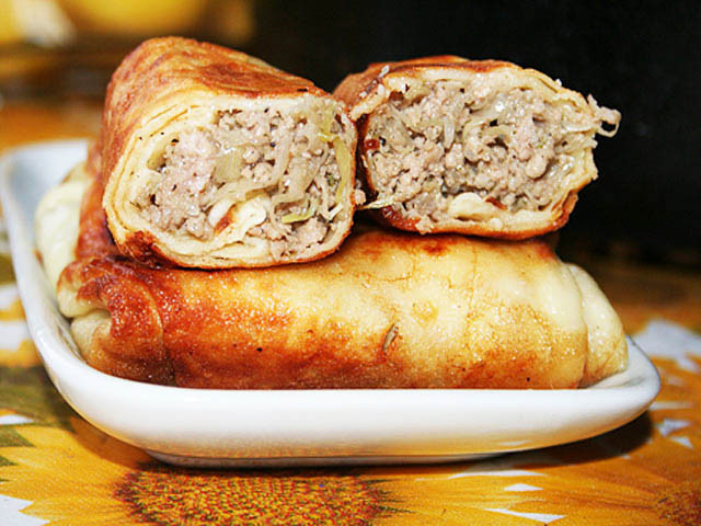 Блины с мясом – одна из самых популярных закусок из теста и мяса. Если осталось после приготовления второго или первого блюда немного отварного мяса, можно его перекрутить и начинить им блины. Тесто для блинов с мясом должно быть пресным или немного солоноватым. Обычно готовят тесто на молоке с добавлением, муки, яиц, небольшого количества сахара и соли. Тесто для блинов с мясом должно иметь жидкую консистенцию.Самый распространенный вариант мясной начинки – это перекрученное в мясорубке отварное мясо и обжаренный репчатый лук. Иногда лук обжаривают вместе с морковью и выкладывают к фаршу. Мясо может быть любое: говядина, баранина, телятина, свинина и т.д.