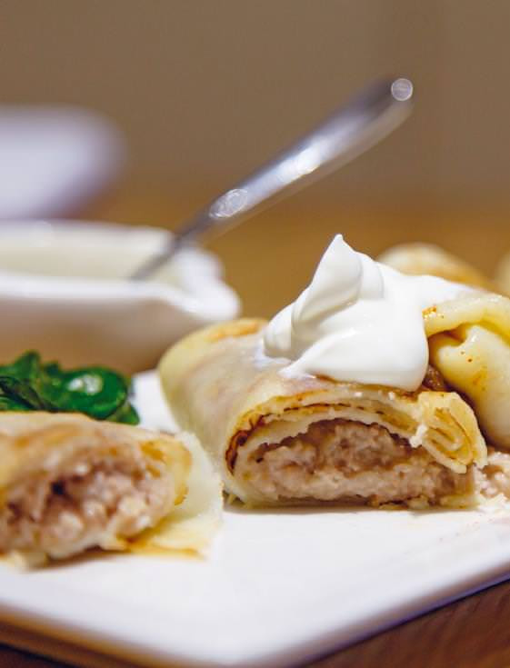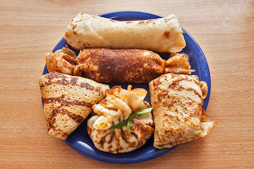 Естественно, блины можно есть «прямо так». Положить блин на тарелку и сверху добавить сметану, варенье, соленую рыбу, икру… да все, что угодно. А можно сделать блины с начинкой. Это удобно тем, что блины можно выпечь накануне, завернуть в них начинку, а утром надо будет лишь разогреть их. Начинки могут быть самые разнообразные: