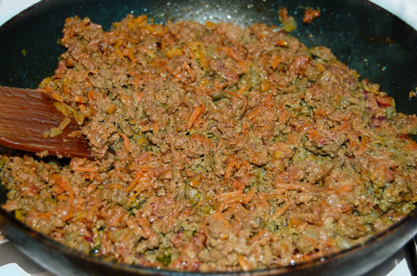 Самый распространенный вариант мясной начинки – это перекрученное в мясорубке отварное мясо и обжаренный репчатый лук. Иногда лук обжаривают вместе с морковью и выкладывают к фаршу. Мясо может быть любое: говядина, баранина, телятина, свинина и т.д.