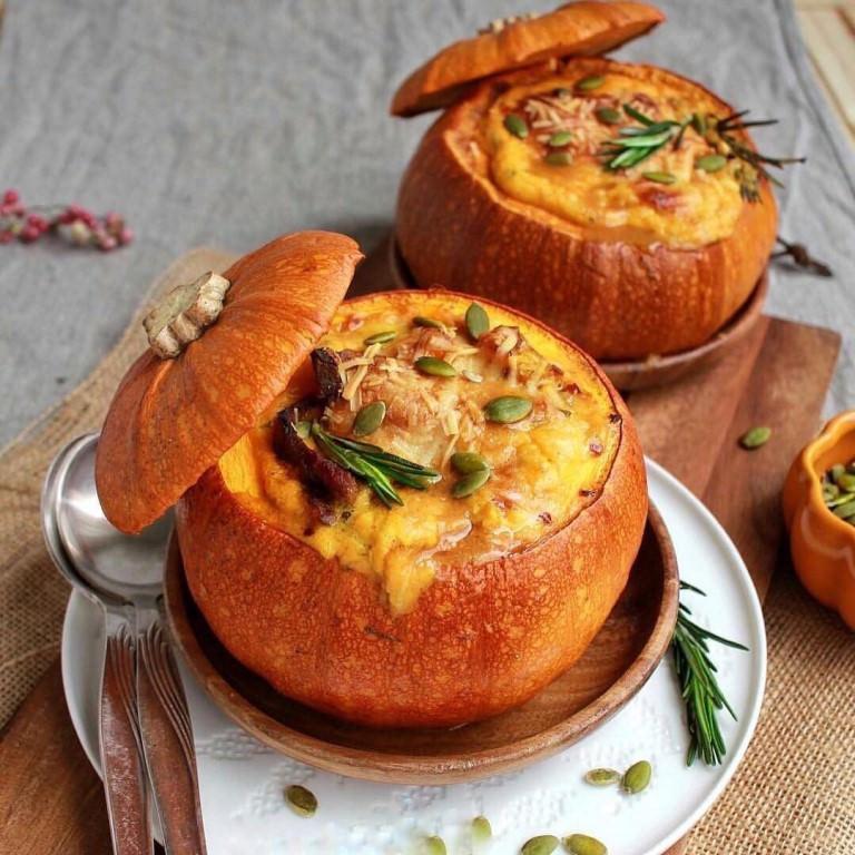 Сладковатая тыква, соленый бекон, сыр, лук и тимьян — невероятно вкусное и ароматное сочетание. Фаршированная тыква не нуждается в дополнениях. Это полноценное самостоятельное блюдо, которое можно подать к обеденному столу. В этом рецепте лучше использовать две маленькие или одну небольшую тыкву: ведь чем плод меньше, тем он плотнее и слаще.