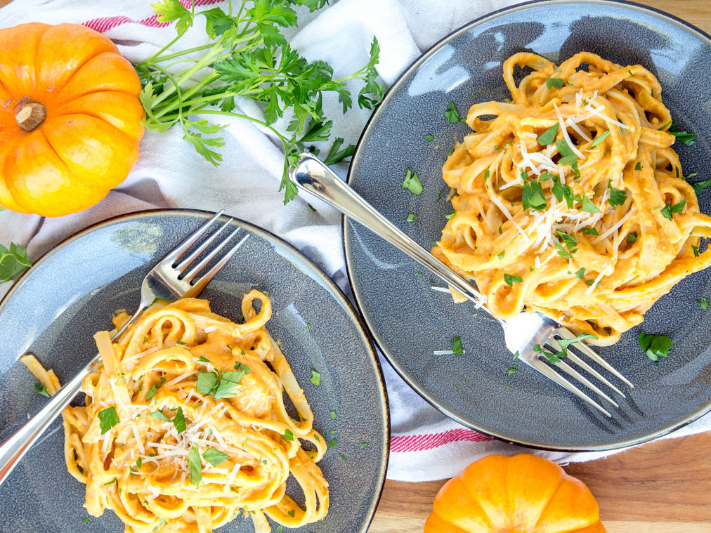 - На большой сковороде пассеруйте на умеренно сильном огне лук и чеснок в 2 столовых ложках овощного бульона. Добавьте тыковку и прогрейте. Выложите теплую смесь в макароны и хорошо перемешайте.