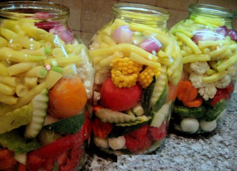 Перед упаковкой в стерилизованные банки овощи помещают в отдельные контейнеры, а затем хозяйка по очереди укладывает их по слоям. Предпочтительно наслаивать продукты контрастных цветов, чтобы заготовка имела захватывающий цветовой узор.